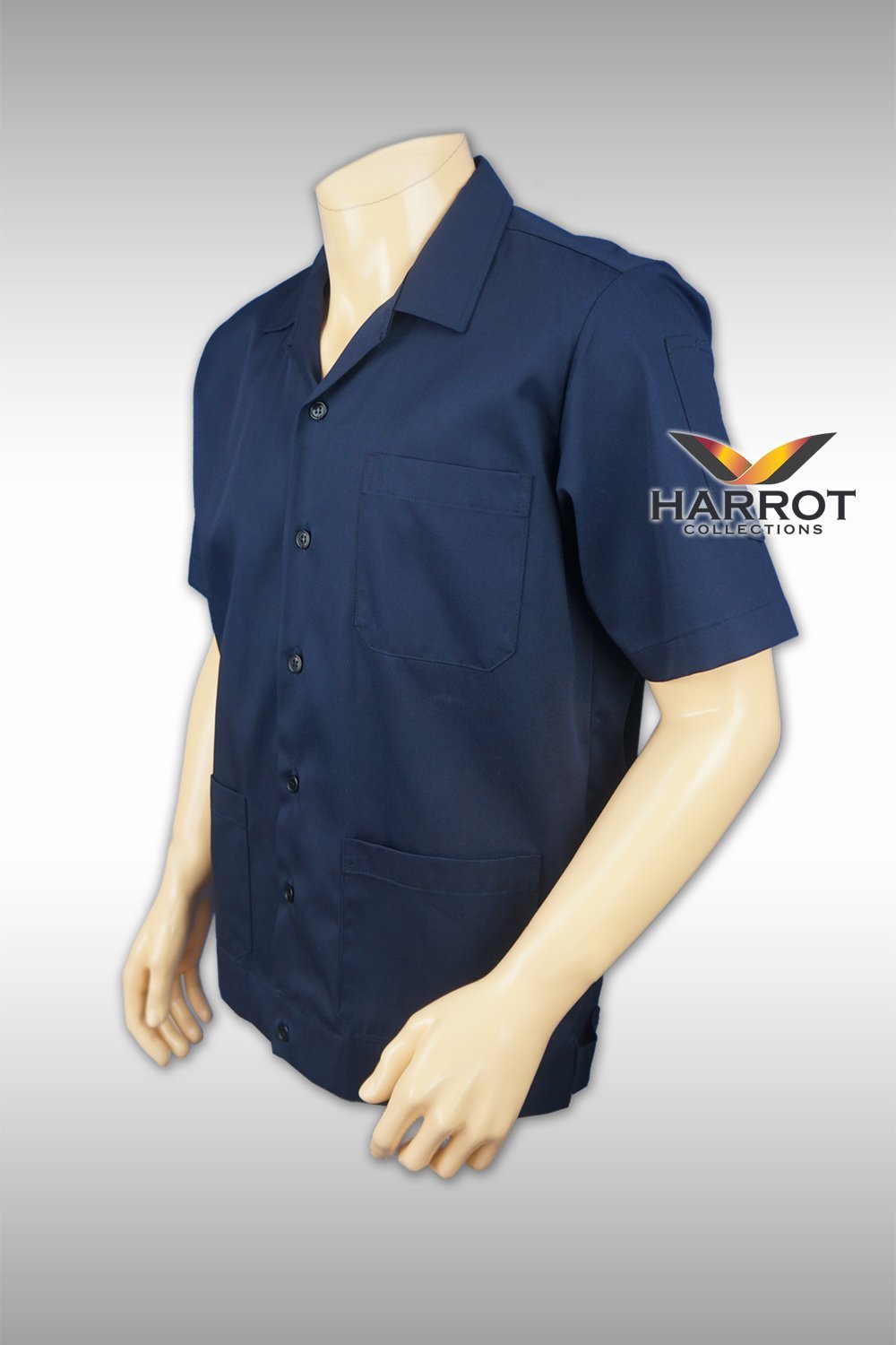 เสื้อช็อปแขนสั้น ดีไซน์ทันสมัยเพิ่มความเป็นมืออาชีพ พร้อมฟังก์ชันการใช้งานครบถ้วน ปกคอฮาวาย กระเป๋าปะ 3 ใบ หน้าอกซ้าย 1 ใบ และ ด้านล่าง 2 ใบ
