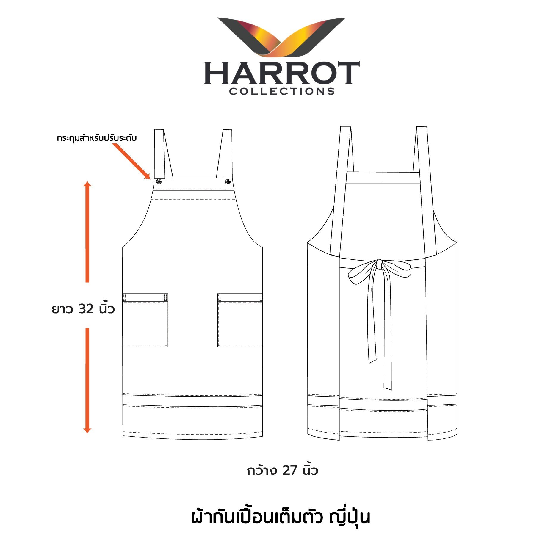 - ขนาดผ้ากันเปื้อน : กว้าง 26 นิ้ว x ยาว 32 นิ้ว