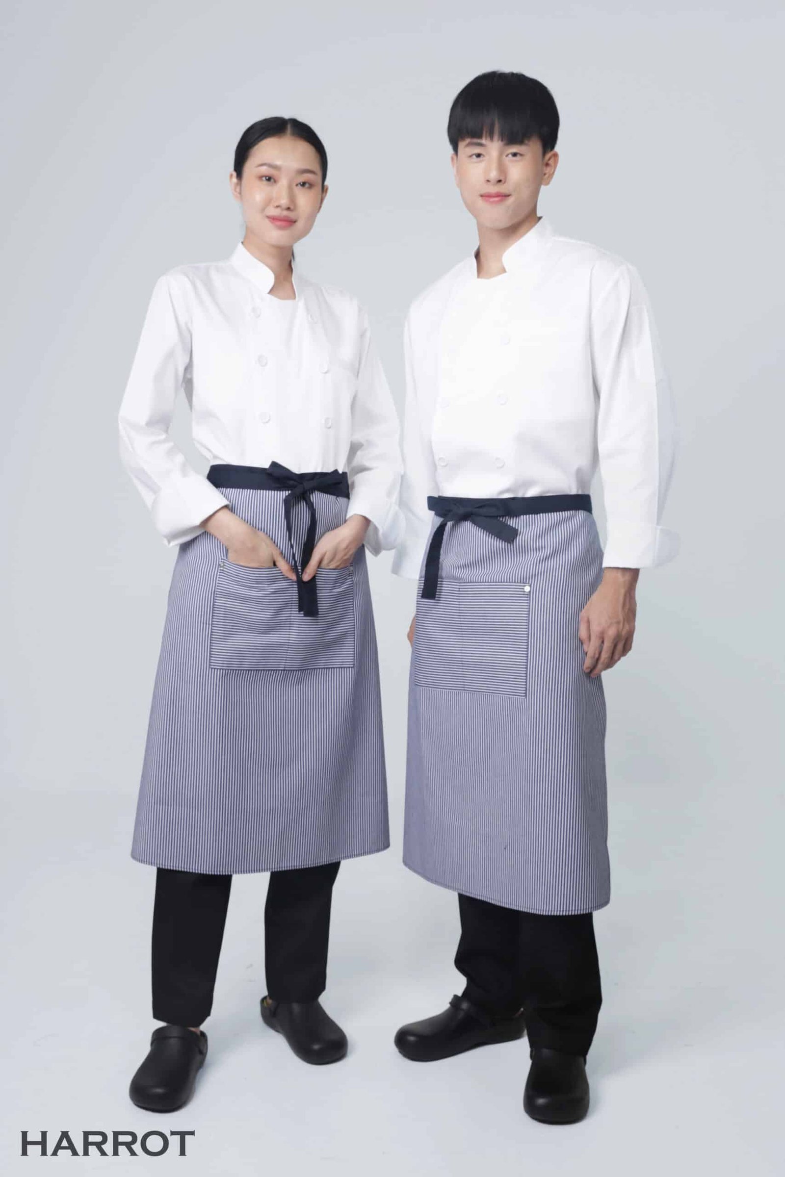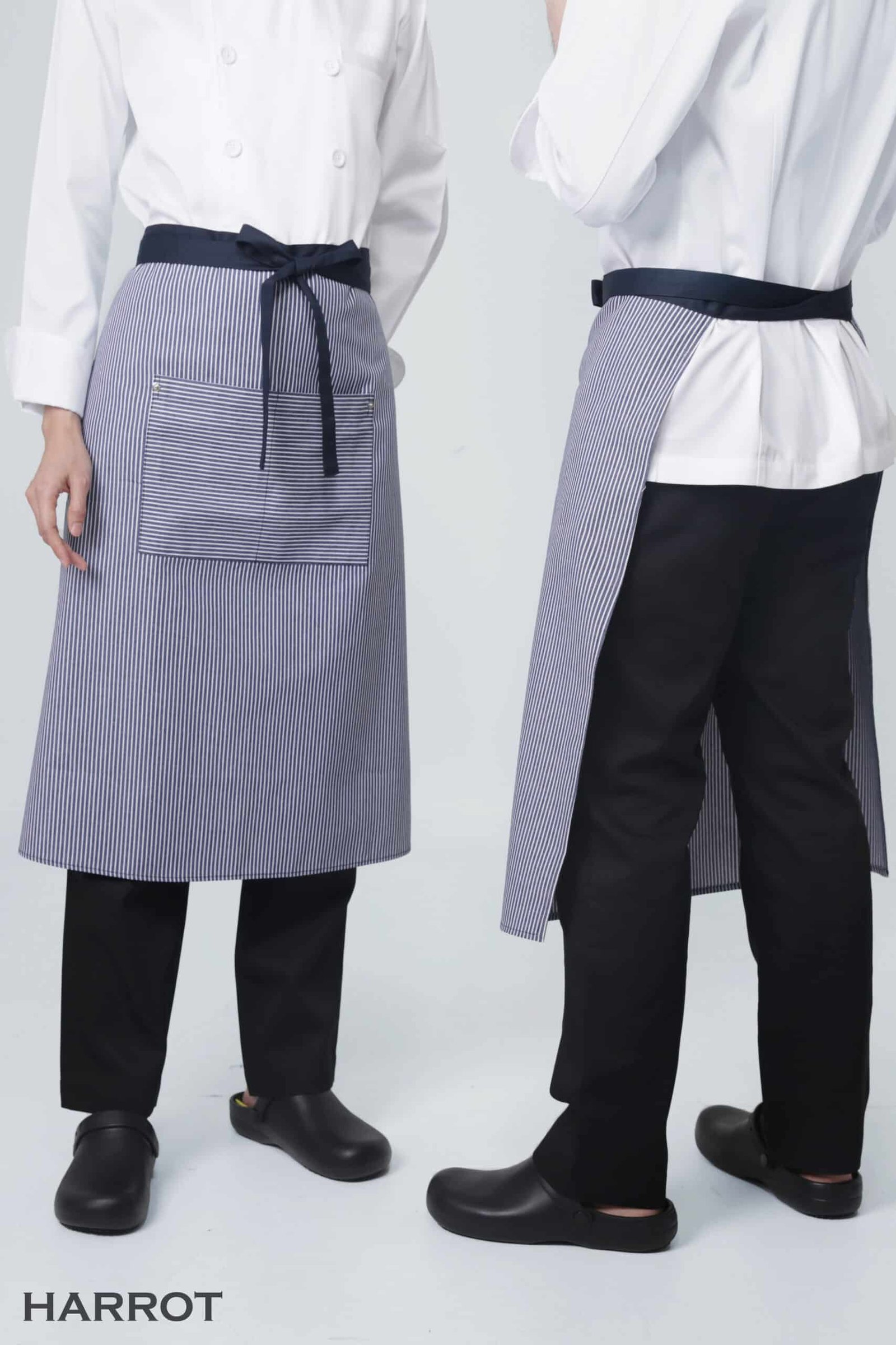 ผ้ากันเปื้อนครึ่งยาวลายริ้วลอนดอน สายยาวผูกหน้าสีกรม รุ่นนี้ถูกออกแบบมาเพื่อมอบความคล่องตัวสูงสุดในการทำงาน เหมาะสำหรับแผนกครัว พนักงานเสิร์ฟ แม่บ้าน และงานบริการอื่น ๆ